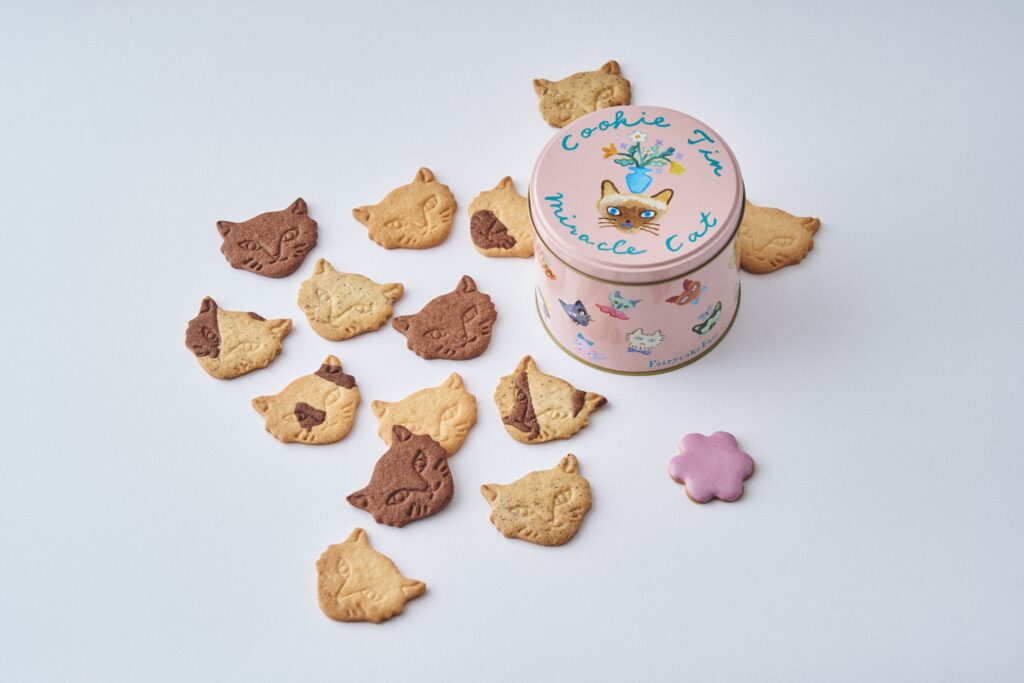 神様のいたずら”のような、不思議な模様やユニークな特徴をもつミラクルキャットたちの愛おしさを伝えたくてうまれたお菓子。ミュージシャン・坂本美雨さん、イラストレーター・前田ひさえさんとの共同制作で誕生した大人気のネコクッキー缶です。心踊る柔らかなピンクを纏った、季節限定デザインで、めずらしい柄など個性が光るミラクルキャットをモチーフに、発酵バターやカカオ、アールグレイを使用したミラクルキャットクッキー5種と、甘酸っぱいラズベリーのアイシングで彩ったお花型クッキーを組み合わせ。毎春、猫好きさんへの贈り物としても大変ご好評をいただいているひと缶です。